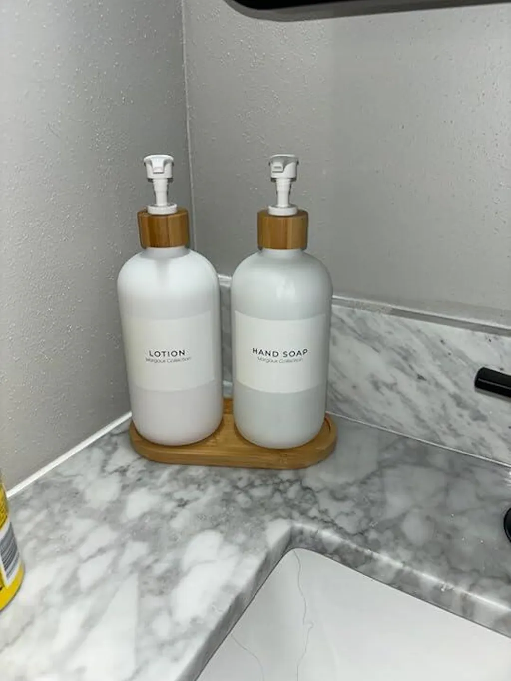 Each order comes with a set of matching soap dispensers, complementary sets of labels, and bamboo tray.