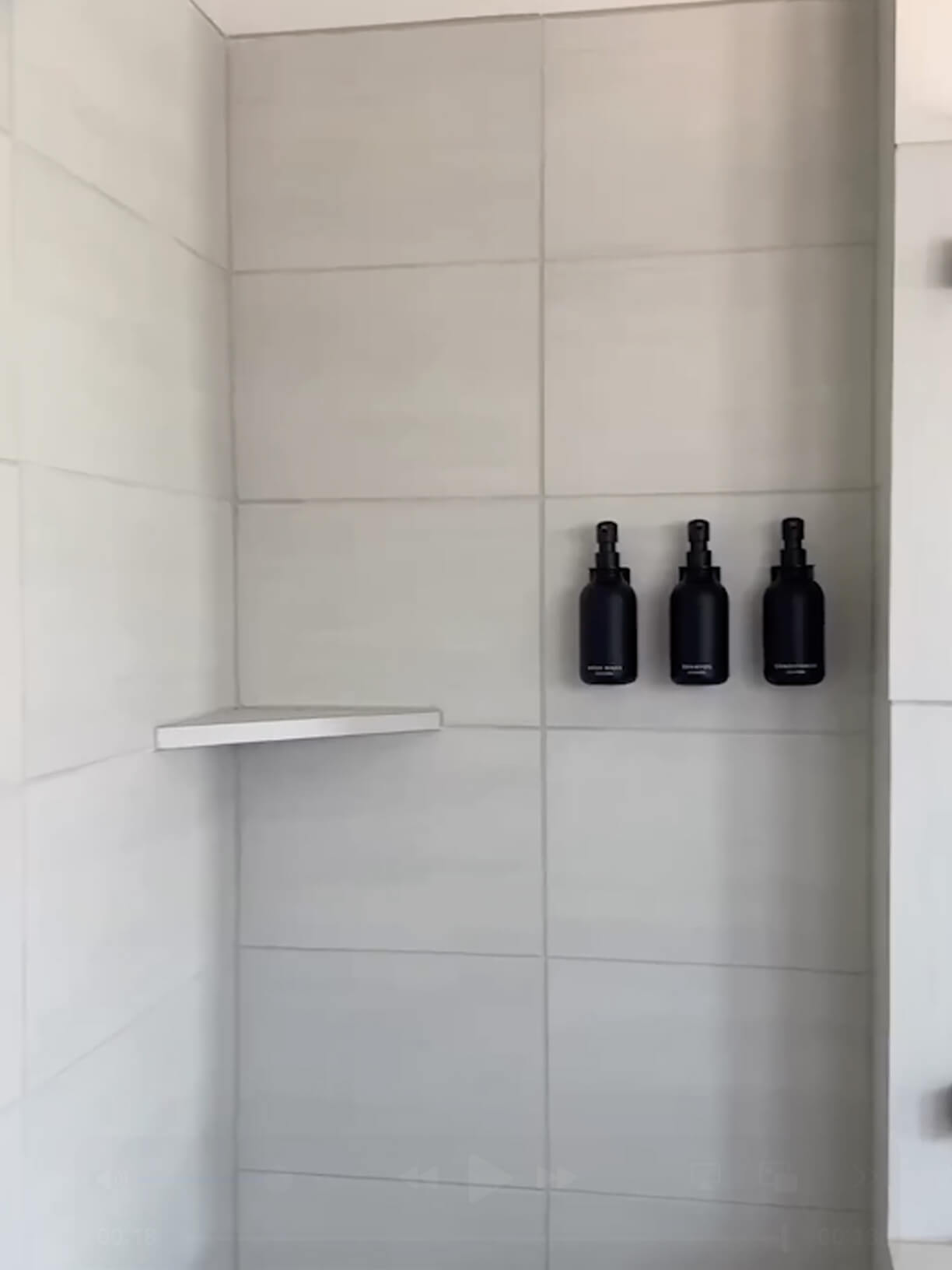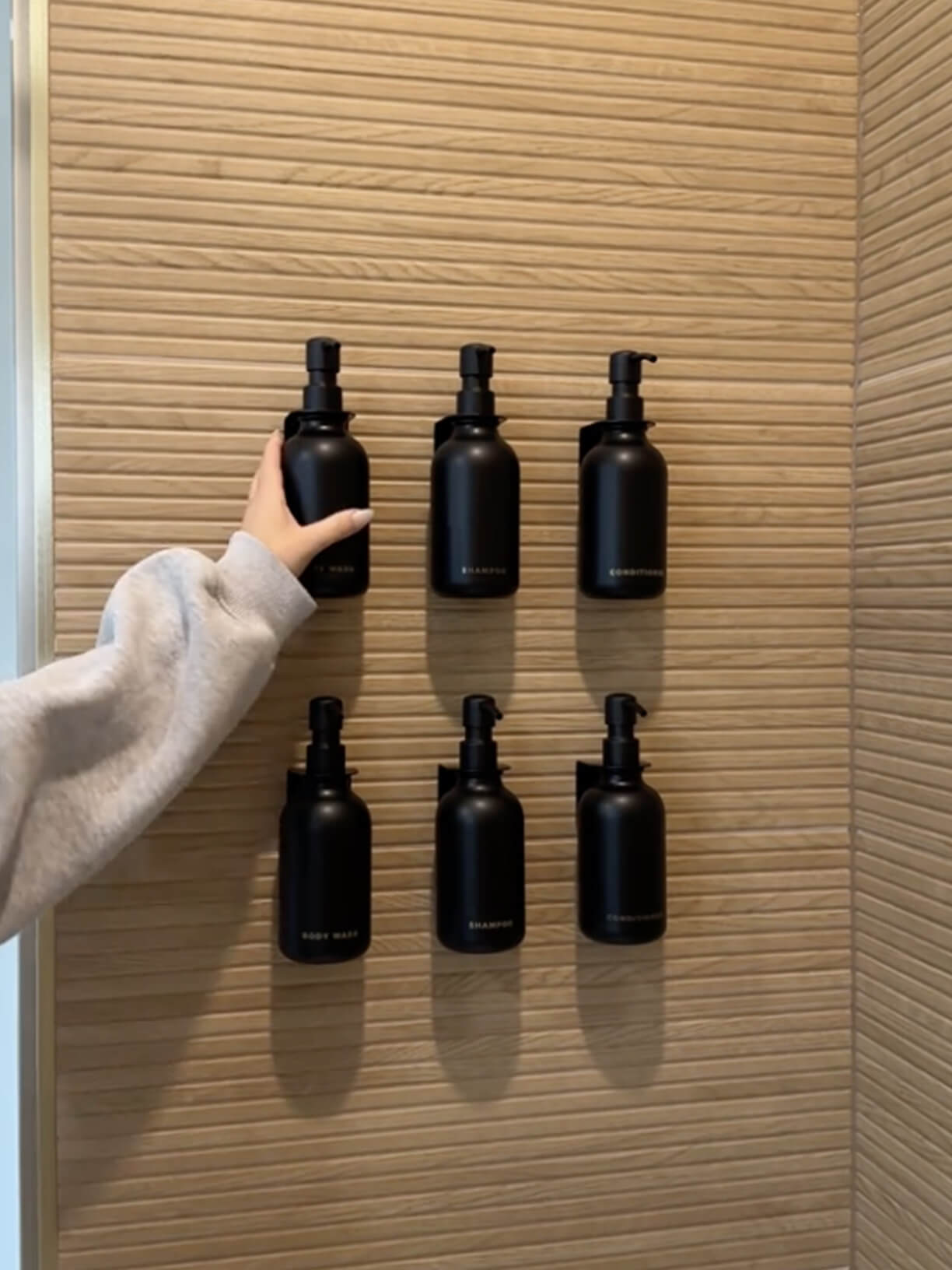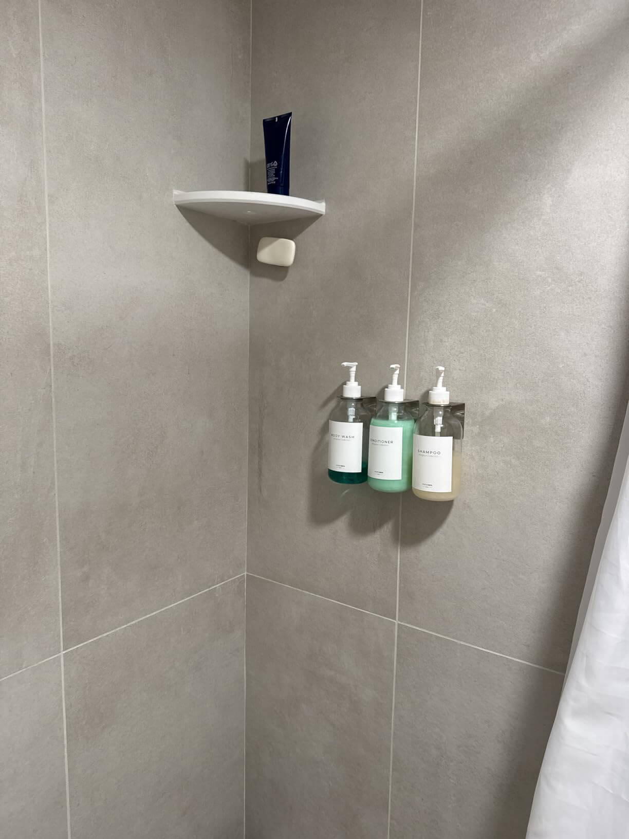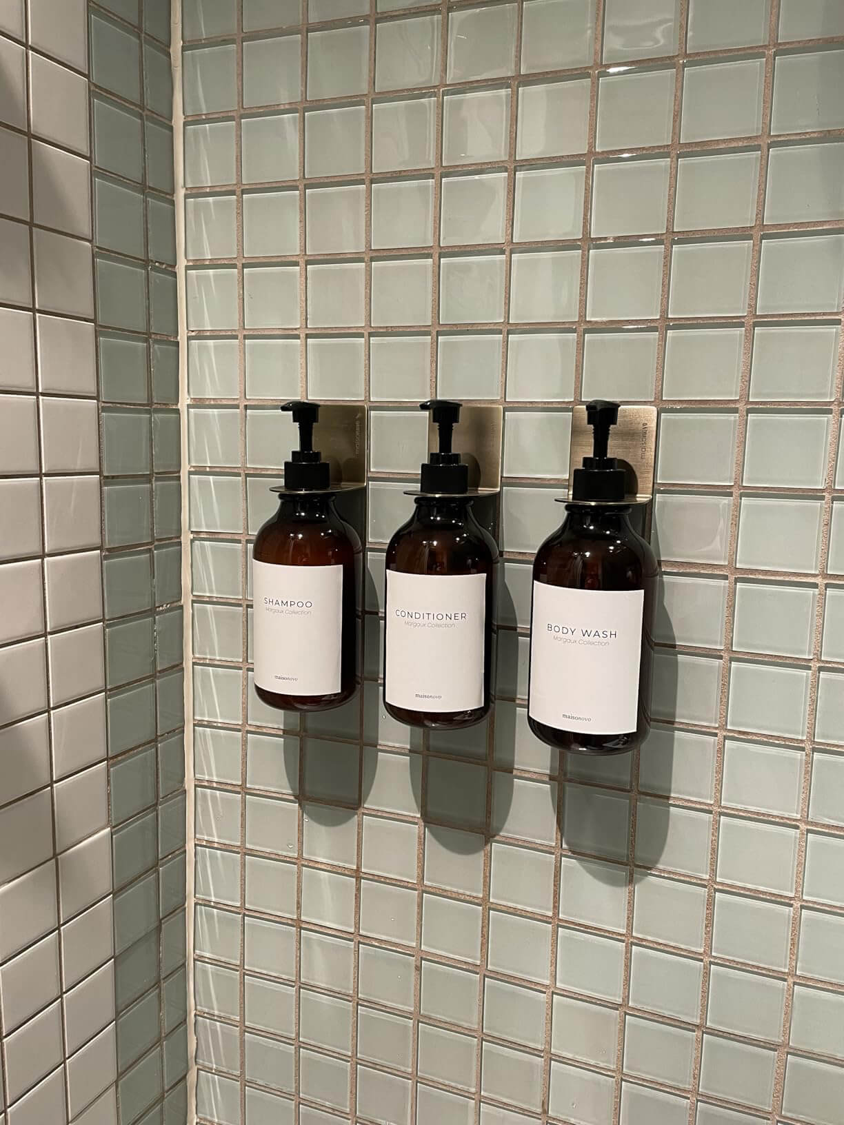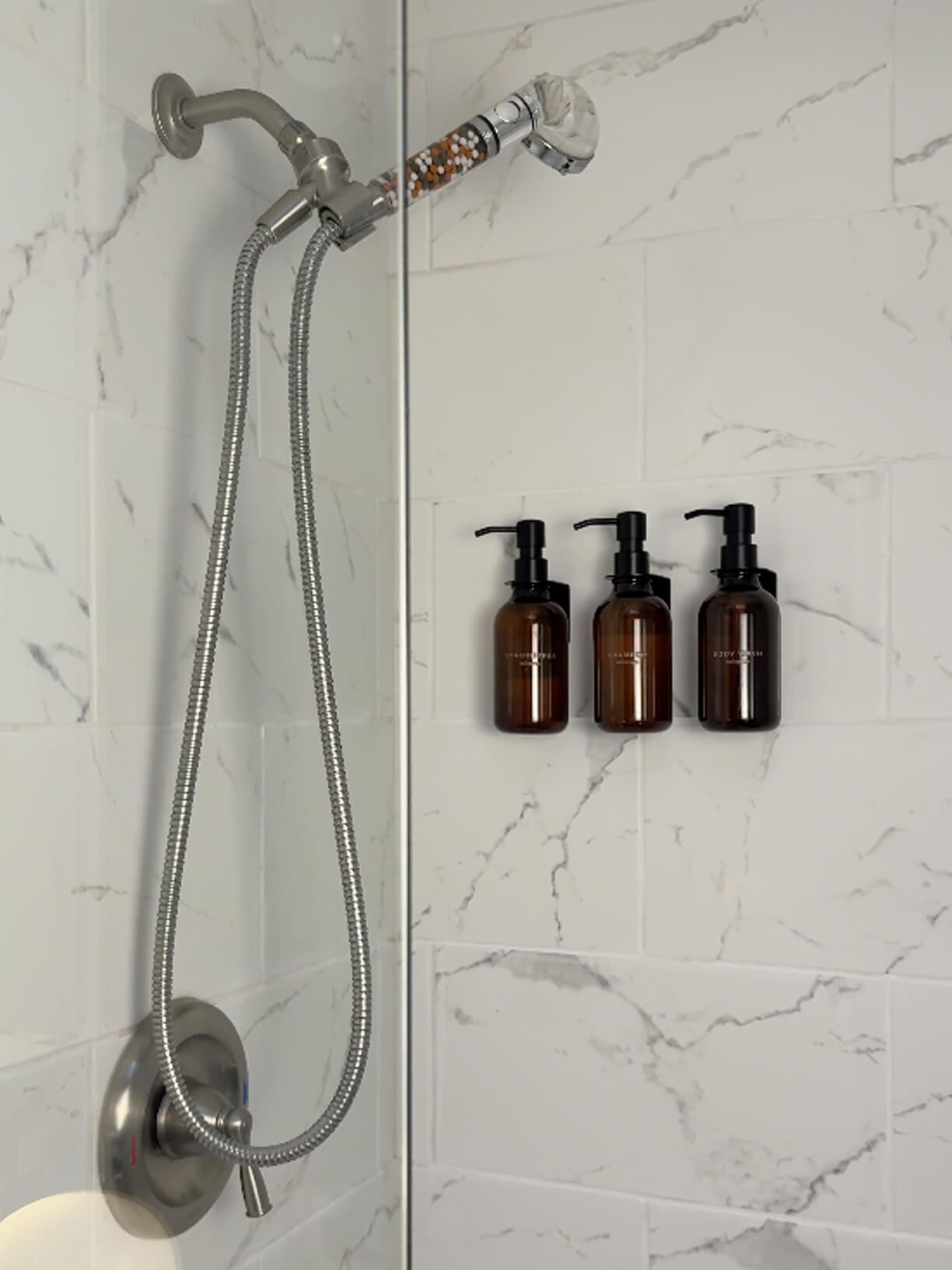 - 3 wall-mount bottles (Body Wash, Shampoo, Conditioner)